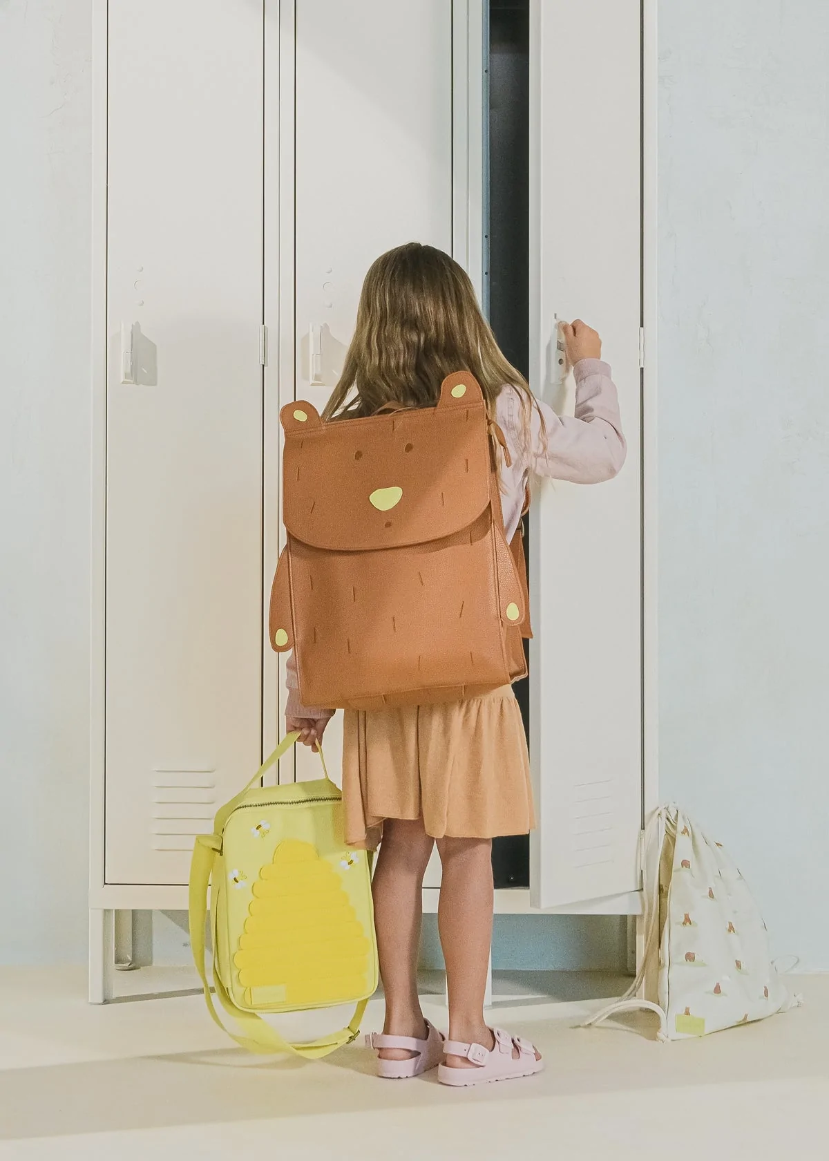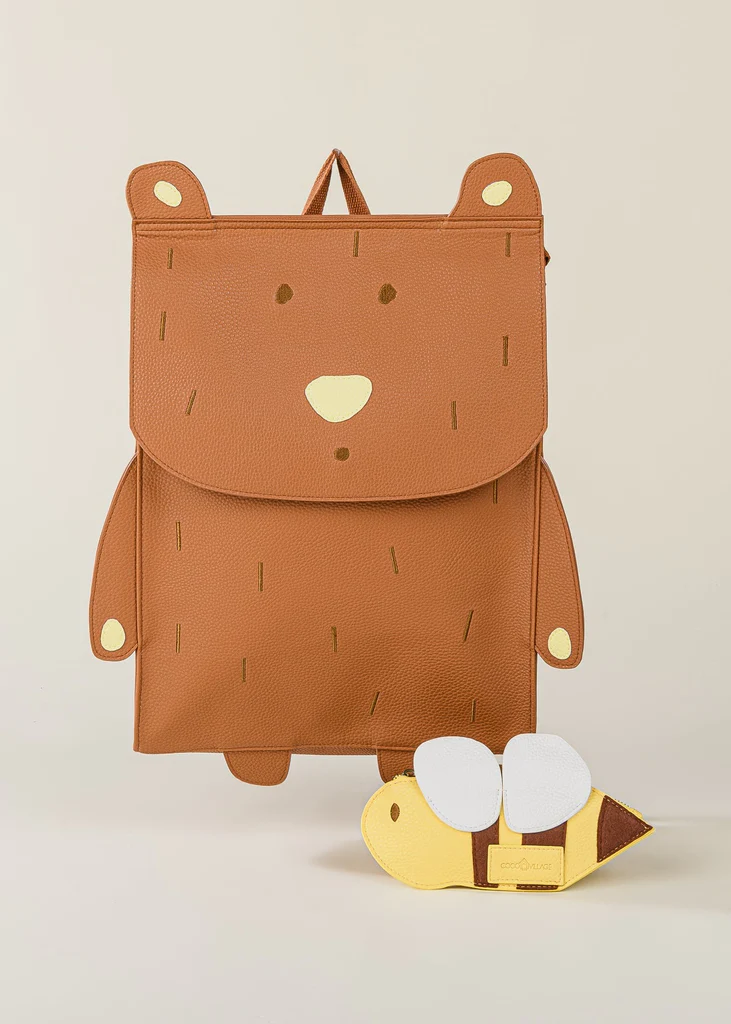 What could be better than a cute little teddy bear as a companion to start the school year! Don't worry, unlike what you might think of bears in the wild, this one is very sweet and loves to ride on little one's backs. This bear is a vegetarian and like its friend Dino, only eats school supplies. Its favorite foods are pencils and erasers. Little Bear loves to walk around and take naps in lockers and doesn't do anything without its best friend, the little bee pouch. Made of vegan leather, no teddy bear (or other animals) were affected in the process.