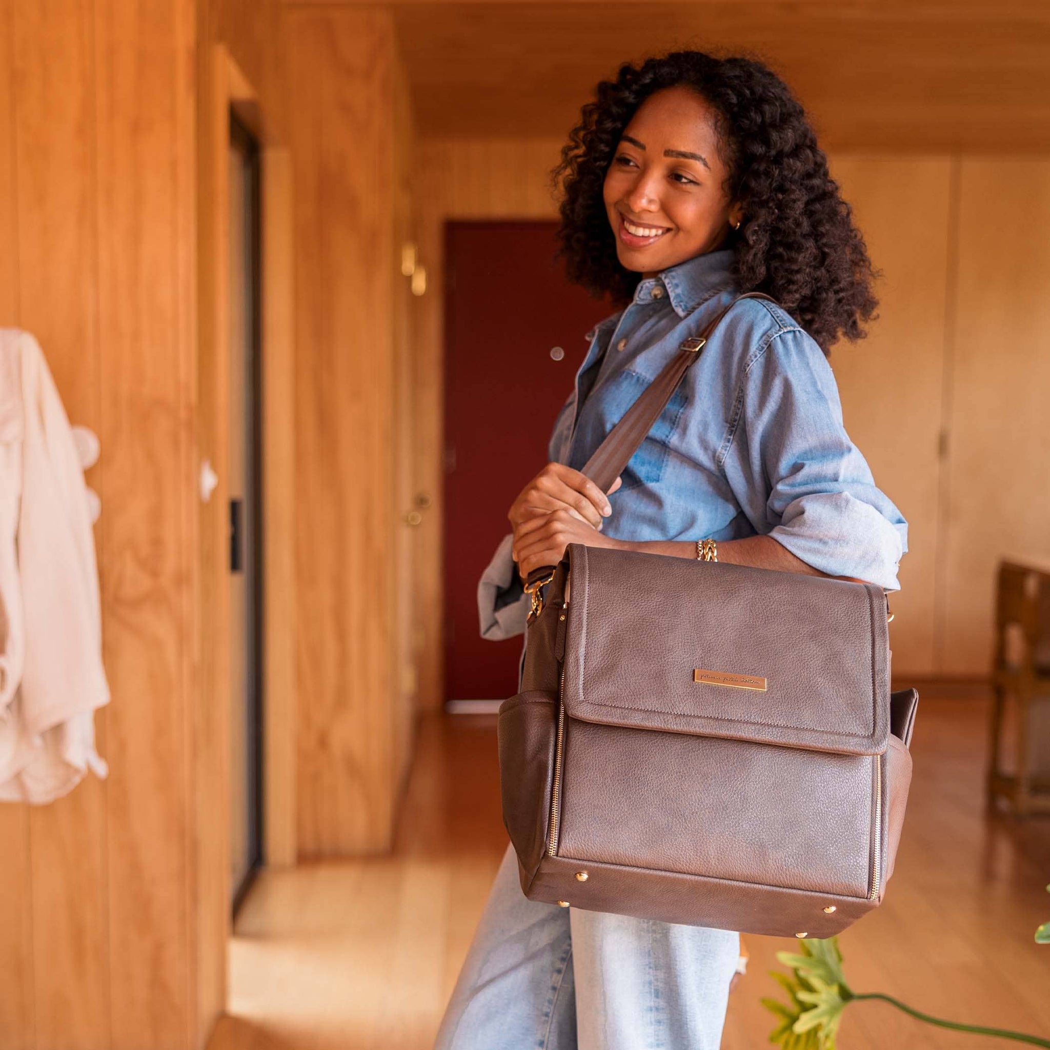 • Zip-out diaper changing station pockets for diapers and wipes • Removable changing mat that is wipeable and machine washable • 2 ways to carry: Backpack or cross-body/on shoulder with long, adjustable strap • Includes stroller straps to attach bag to most strollers • Spacious interior with 5 pockets (2 to stow bottles) and a key clip • 2 exterior bottle pockets • Wide zip-top opening for easy access to contents • Magnetic front flap closure, plus snaps for added security • Top grab-handle for easy toting • Water-resistant interior and exterior • Metal bag feet protect the bottom of the bag • Includes zippered pouch that attaches to the side D-ring