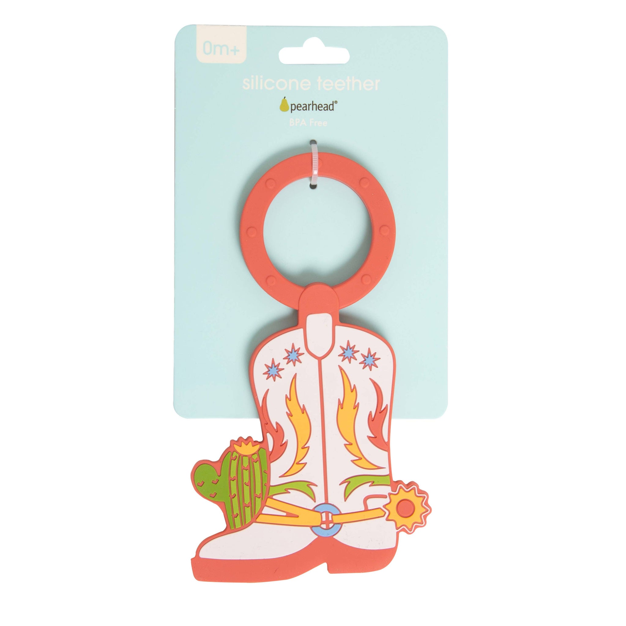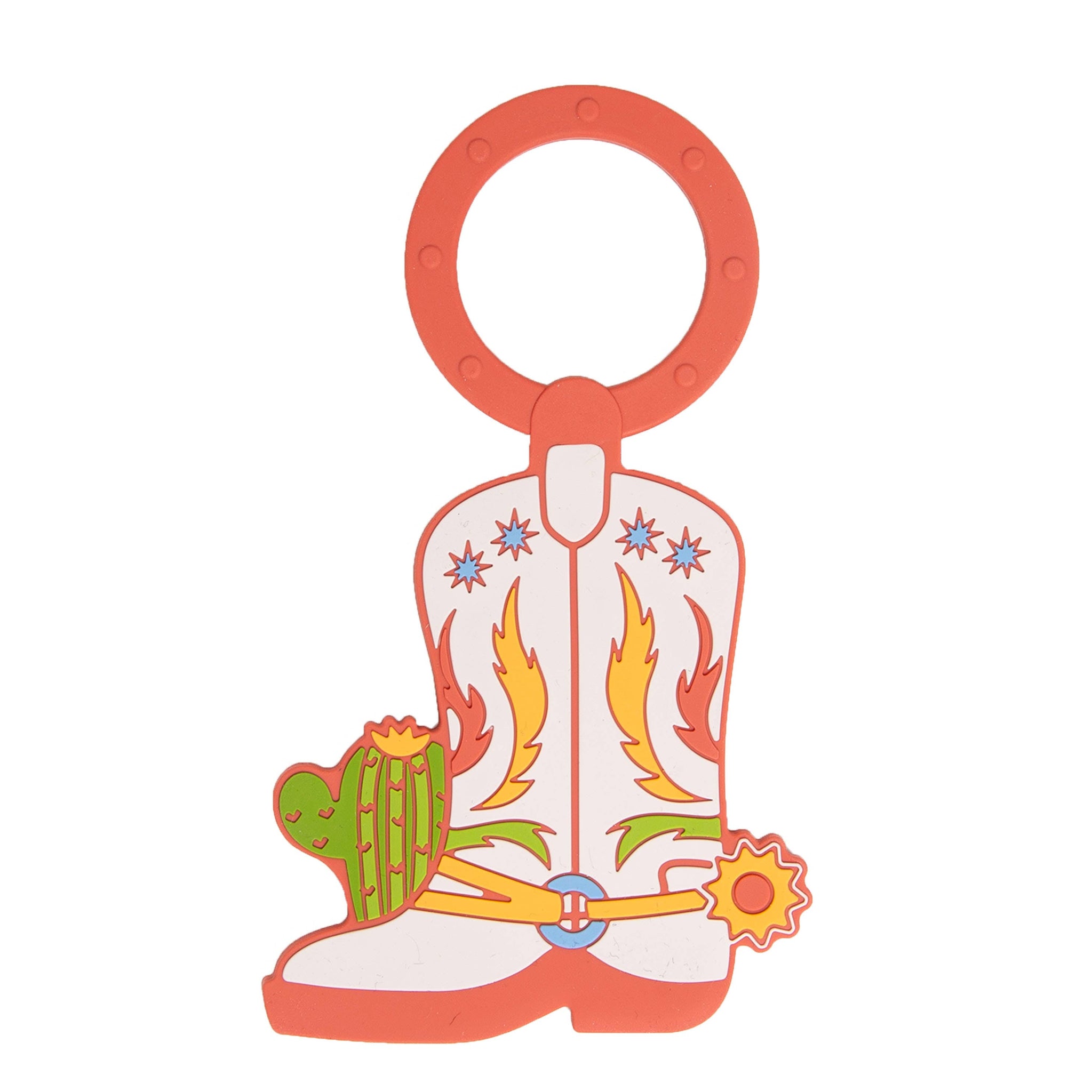 · Adorable Cowboy Boot Design: The Pearhead Cowboy Boot Teether Toy features a cute cowboy boot hanging from a soft, easy-to-grip silicone ring, bringing a playful, gender-neutral element to baby’s teething essentials. · BPA-Free Silicone for Safe Chewing: Made from 100% BPA-free silicone, this infant teether ring offers a safe and gentle option for your baby’s sore gums, giving you peace of mind as they chew. · Perfect for Little Hands to Hold: The circle shape is designed for easy gripping by tiny hands, encouraging your baby to practice their fine motor skills while providing relief from teething discomfort. · Easy to Clean and Maintain: Made from durable, high-quality silicone, this soothing teether is incredibly easy to clean. Simply wipe or rinse it off, ensuring it’s ready for your baby’s next teething session.