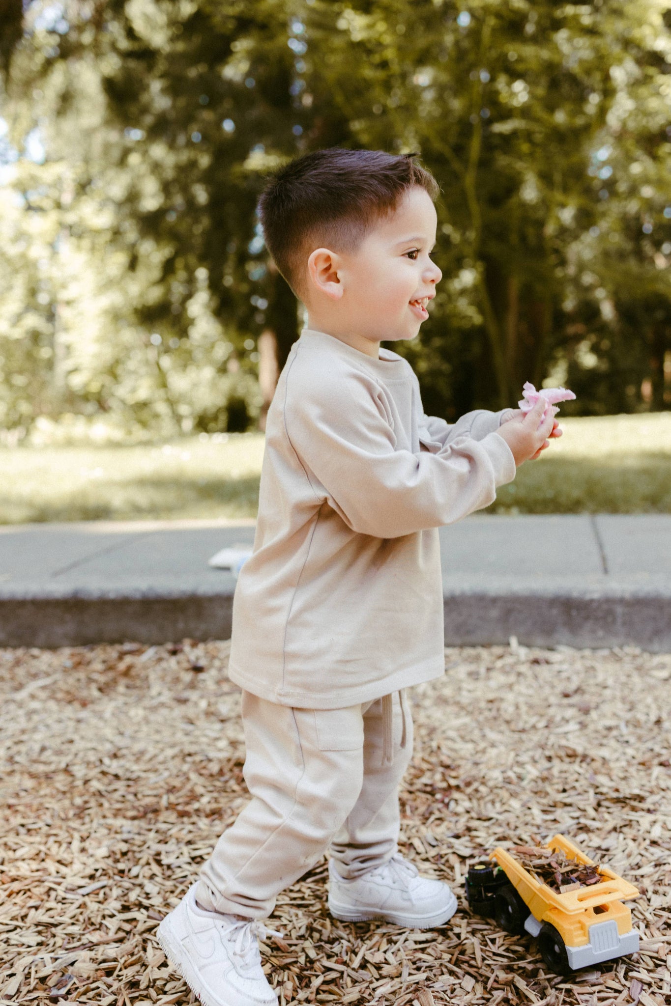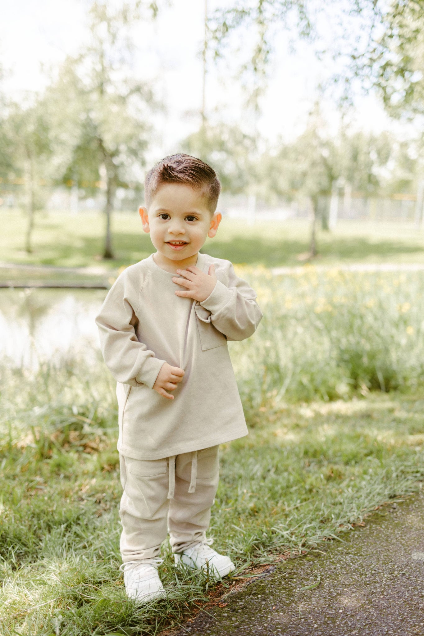 This Raglan Playwear Set in Pale Grey is made of super soft cotton and designed for a gender neutral, oversized fit. It features a high quality, long sleeve raglan top and jogger style pants with square pockets and oversized fit. This set is perfect for year around playwear in a beautiful muted light grey color.