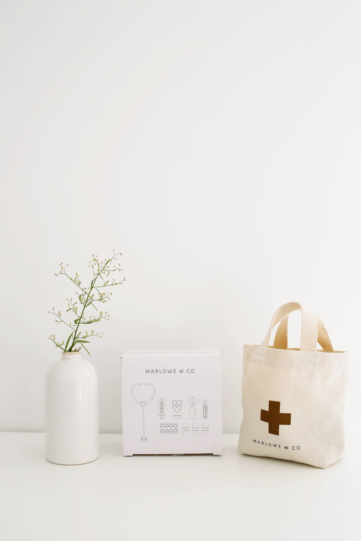 Marlowe & Co's doctor kit is an open-ended toy designed to spark imaginative play and introduce your child to the world of healthcare. This set is perfect to help teach your little one about medical tools and help prepare your child for real life experiences at the doctor’s office. Your little one will love giving you and their stuffed animals a check up encouraging fine motor and social skills. Everything fits nicely in an adorable cotton tote for convenience and storage. Our doctor kit is a wonderful addition to any child's toy collection. Watch as your child's empathy and creativity flourish while they embark on exciting medical adventures!