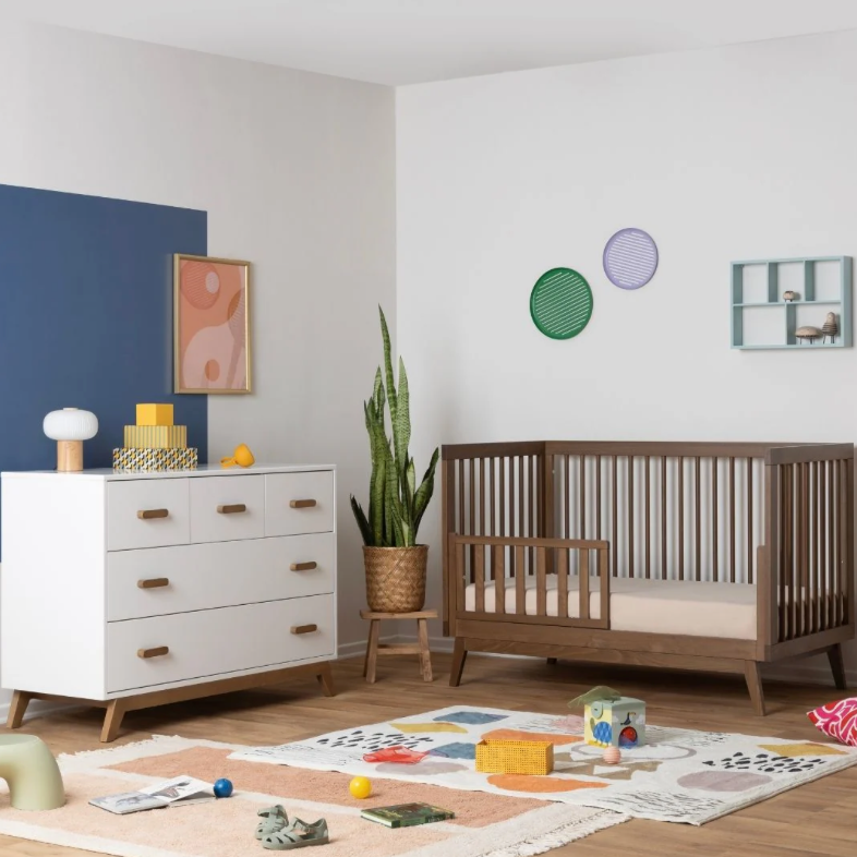 Newly updated to meet the latest safety standards! The 2.0 version of the modern Soho 5-drawer Dresser’s classic style pairs perfectly with the Soho 3-in-1 Crib, or adds a pop of mid-century style to any room on its own. Safe, stable, and strong, with sturdy angled legs and solid wood handles, forged steel support, and a baby-safe painted finish.