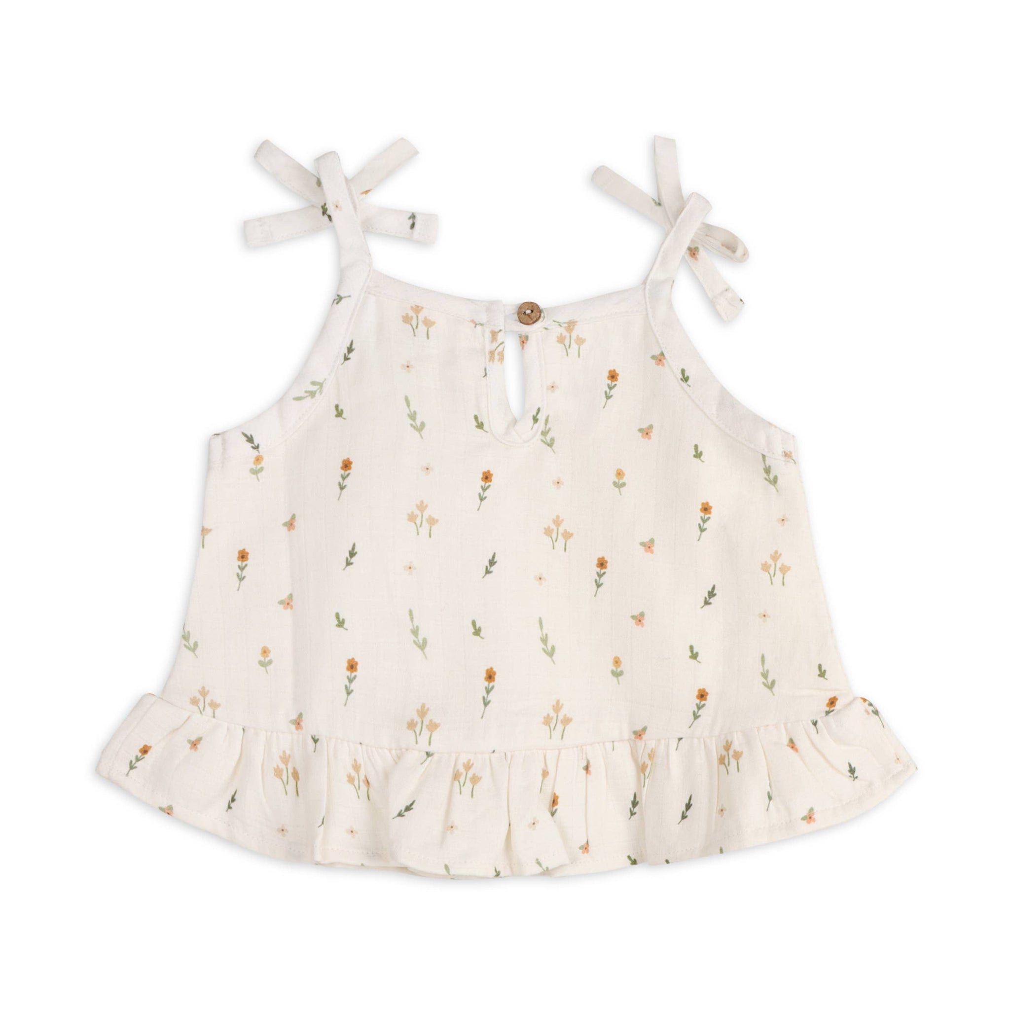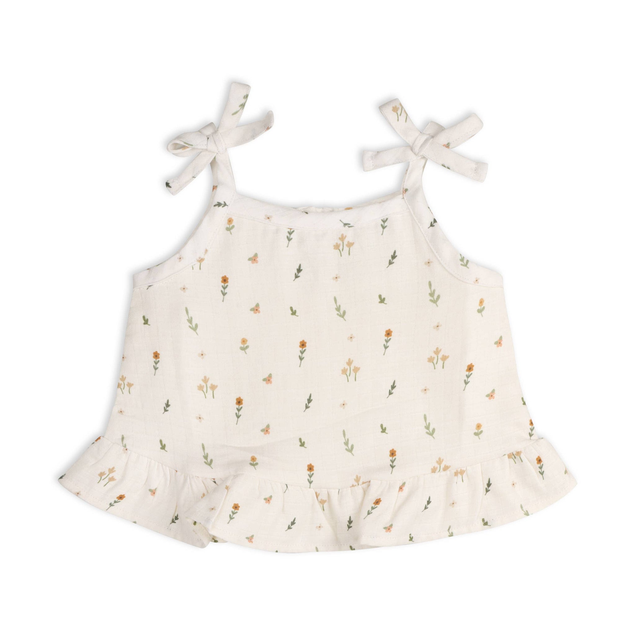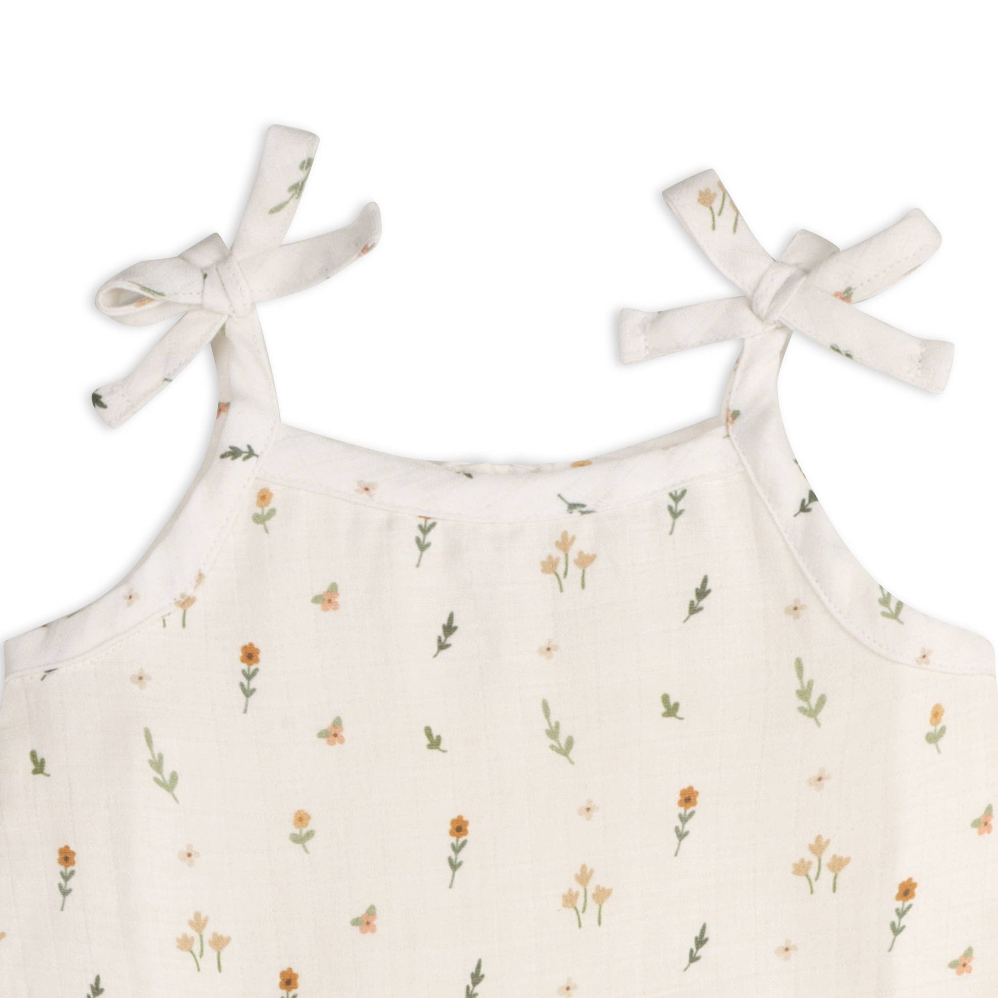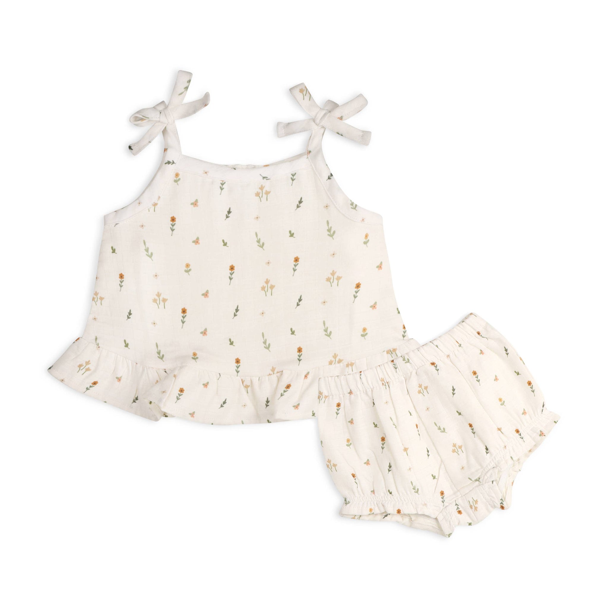 The sleeveless baby top and bottom set with shoulder straps and matching bottoms is made with ultra-soft organic muslin fabric.