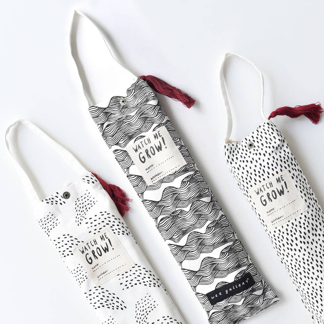 This growth chart features sweet ocean animals that will keep you smiling as your little one grows. Ethically and sustainably made in India using screen printing on organic cotton canvas, finished with a waxed cotton twine hanging cord and stylish fringe end. Comes in a special keepsake bag with a place for your child’s name and birth date.